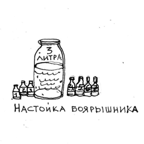 – Есть! – воскликнула она торжествующе, выуживая на свет пыльный маленький пузырек темного стекла, в каких обычно продают в аптеке лекарства. – «Настойка боярышника» – наставительно сообщила дама Ляльке, – на семь пузырьков – три литра воды, соответственно на один – пятьсот граммов! – и для сердца, кстати, полезно! Счастье, что не вспомнили наши пропойцы о божественной опохмелочке, – радовалась она, смешивая ингридиенты и разливая мутную жидкость по рюмкам.