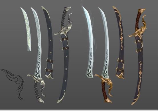 Перед небожителем в воздухе медленно вращалась пара мечей[6]. Богато украшенные ножны и не менее роскошные гарды. В обоих прослеживался схожий мотив. Различались лишь цвета. Первый – тёмно-серый с позолотой. Второй – тёмно-серый с чернёным серебром. Оба клинка, судя по форме, что-то между саблей и шашкой. Сама гарда массивная, защищающая ладонь почти целиком.