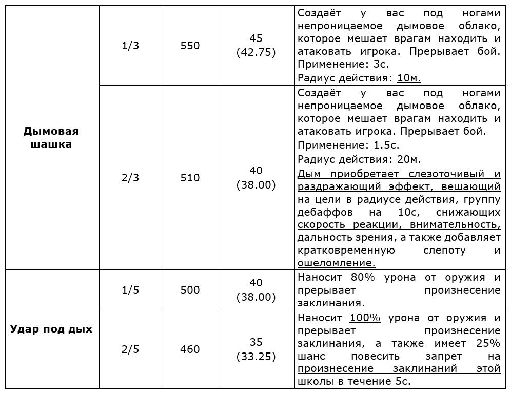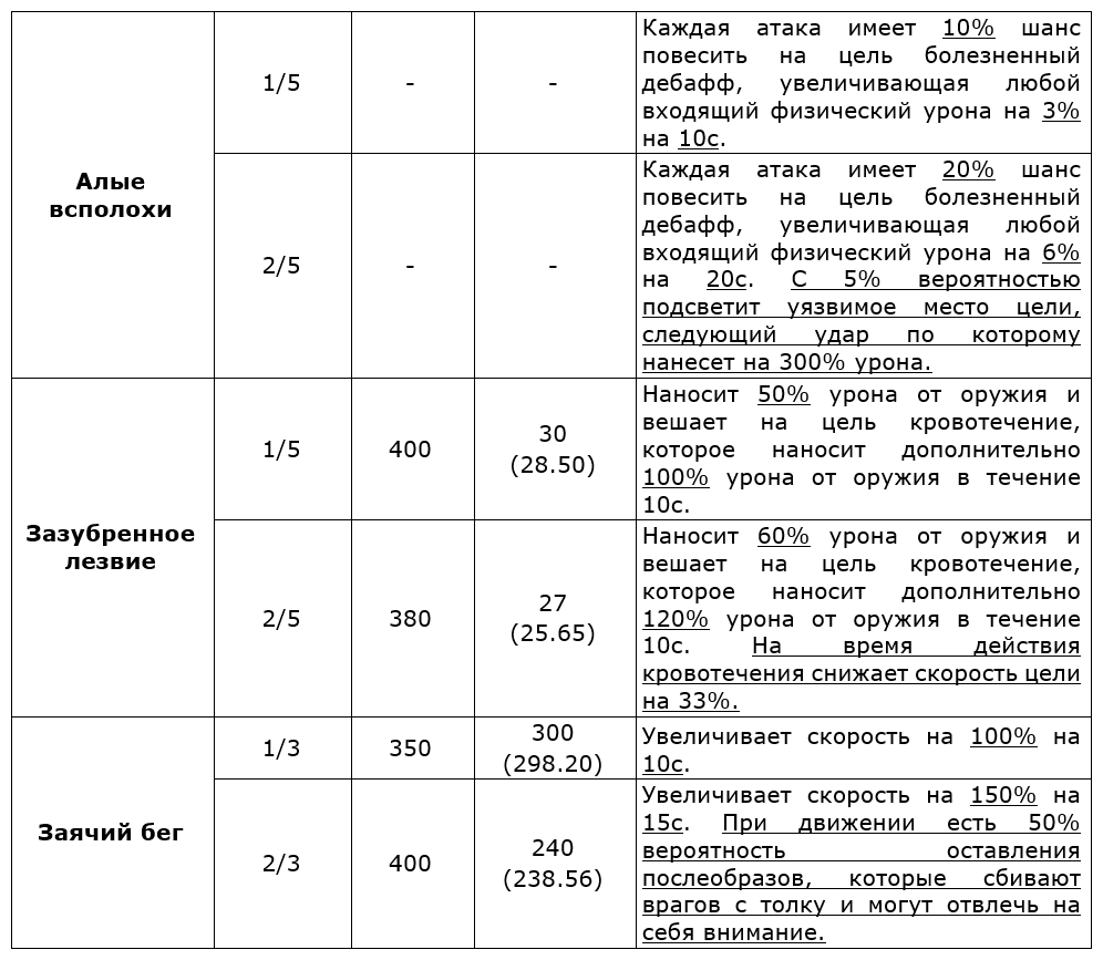 В наличии 7 очков талантов, куда вложить? Теневой сдвиг – очевидно. Удар в спину – открывашка по умолчанию. Ярость бури – свою пользу доказала, повезло, что Соверетт научил. Дальше, Потрошение берем, хороший финишер обязательно пригодится. Теперь нужно несколько утилитарных апгрейдов для облегчения жизни – Заячий бег, Дымовая шашка с новым свойством будет конфеткой – ошибся я на её счёт, и Алые всполохи – больно низкий шанс активации на 1 уровне, да и дополнительный прок на 300 % урона заставляет облизываться.