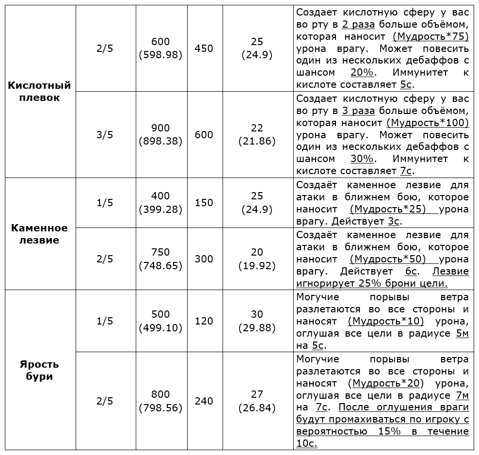 Так, а что стало с Кислотным плевком, Каменным лезвием и Яростью бури? Стоимость в мане возросла в несколько раз. Плюс, раньше урон скалировался от интеллекта, а теперь – от мудрости? Что поменялось за это время? Единственное, что приходит на ум – я выбрал архетип. Возможно, пока оставался шанс, что я стану магом, заклинанию позволялось на близкой дистанции быть такой имбой[15], а теперь его понерфили[16], поскольку милишнику это будет слишком жирно. Грусть-печаль. Сейчас заклинания ещё не плохи, но очень скоро, когда очки здоровья мобов будут исчисляться десятками тысяч, как и мои атаки, их полезность резко упадёт.