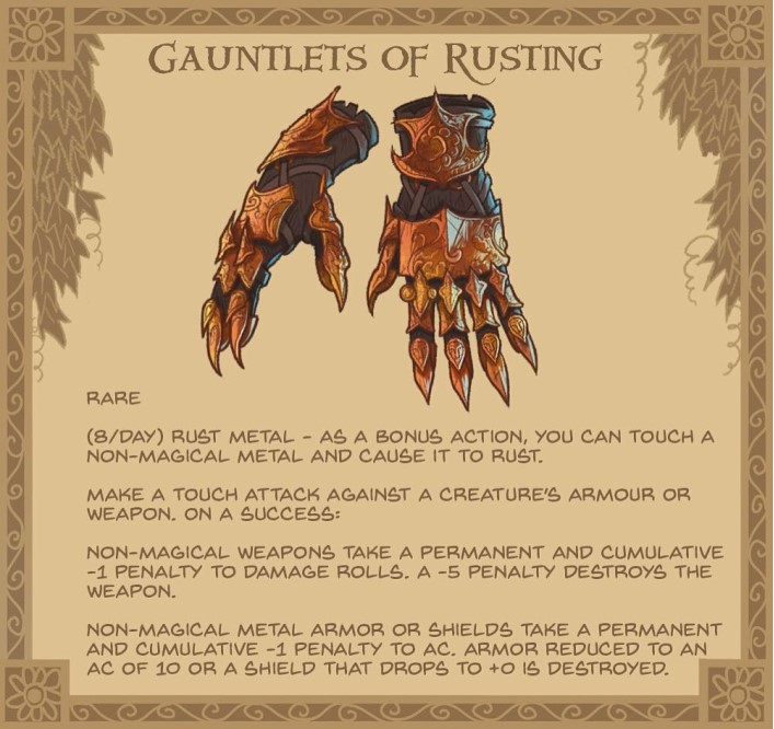 Использование: Раз в 24 часа позволяет активировать магию при физическом контакте с металлом, которая покрывает его зачарованной ржавчиной. Обычный предмет рассыпается в течение двух минут. Магический предмет покрывается коррозией на пять минут, в течение которых он будет чрезвычайно уязвим к физическому урону и ослаблен на 75 %.