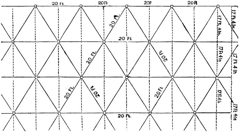 The order of planting is a matter of some consequence, and should be settled upon before commencing the work. The simplest form, and that most usually adopted, is the square; furrows are drawn across the field, at whatever distance the plants may be desired to stand, and crossed by others equally distant and at right angles to the first. These will, by their intersections, indicate the stations to be occupied by the trees. Some planters introduce a tree at the centre point between each four, and this has been called quincunx, but erroneously—for the true quincunx is constituted by one central tree surrounded by six, and all are equidistant, as illustrated by the diagram, figure 26. This gives as many trees as possible upon the ground, all equidistant, at twenty feet apart, or at any other distance. It will be seen, that, in laying off this ground, whether with the plow or simply with stakes to indicate the stations which the trees are to occupy, we may first strike our furrows or set our sight poles, all in one direction, parallel, and at seventeen feet four inches apart. Crossing these at right angles, we may draw parallel furrows every ten feet, and by setting our stakes at each alternate intersection of these furrows, the proper stations will be found for planting trees in the true quincunx order, in which every tree will occupy the corner of an equilateral triangle, and will be equidistant from six surrounding trees. If any one prefers to dig holes with the spade, instead of the more economical method proposed, by using the plow, the stakes may be set in parallel rows, in such a manner, that in every alternate row the first stakes shall be advanced one-half of the desired distance from the base line. It will be desirable in this, as in every other system, to have a measuring-line at hand to prove the work from time to time, and make corrections; for, otherwise, the most careful planter will soon get out of range. When the stakes are set properly, on level ground, they should range correctly in all directions. If the plantation be upon an uneven or hilly surface, it will be found almost impossible to lay off the ground with absolute precision; but this is a matter of very little consequence, as the growth of the trees will soon conceal any slight defects, particularly if they be trained with low heads. In the small fruit garden greater precision is desirable, and should be attempted, but in the commercial orchard, containing hundreds or thousands of trees, such exactitude is scarcely attainable if it were desired. Sometimes the aid of the civil engineer, with his instruments, is called in by the very precise planter.