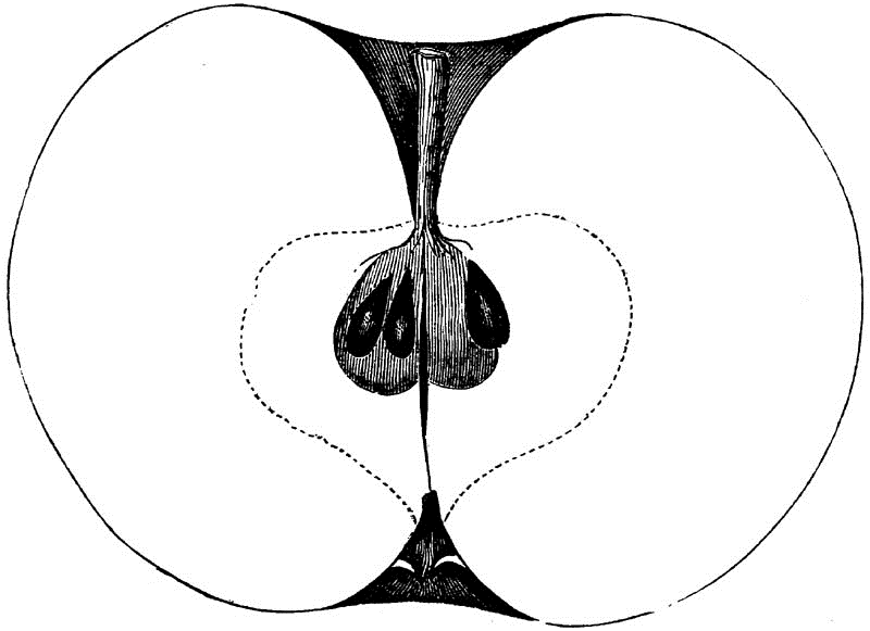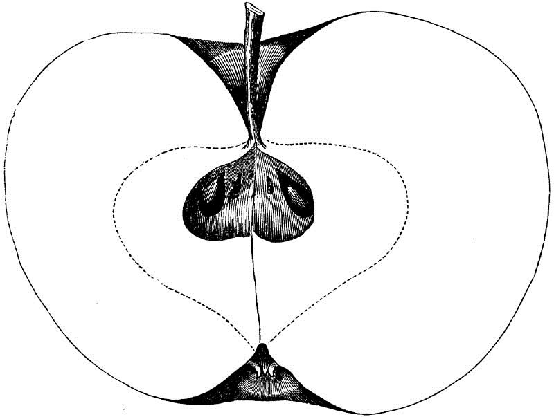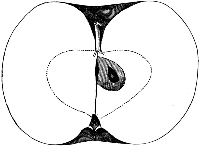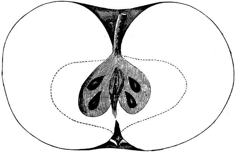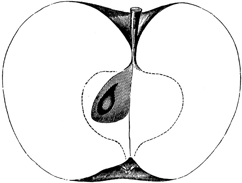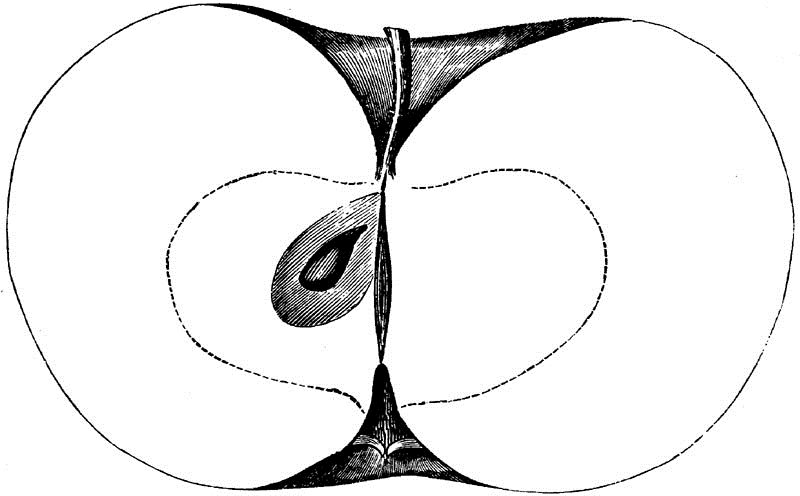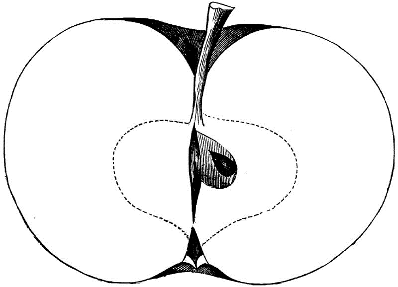 Core roundish, flattened, open, clasping the eye; Seeds numerous, pointed, pale; Flesh tender; Flavor sweet; quality very good; Use, kitchen, stock; Season August, September.