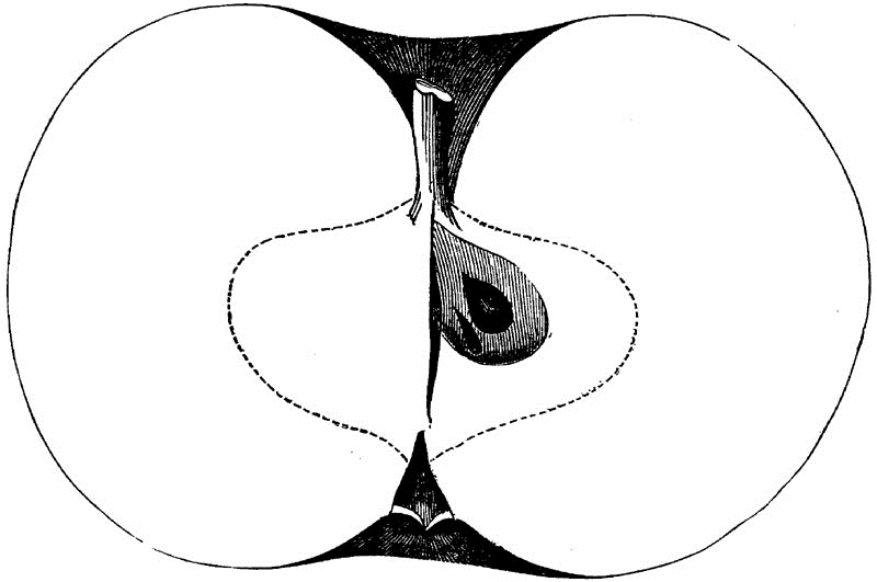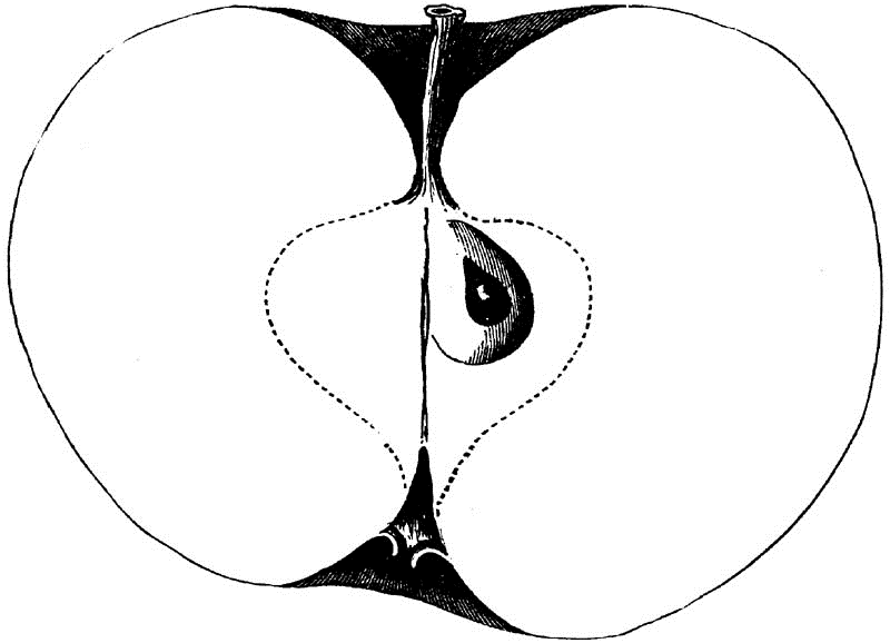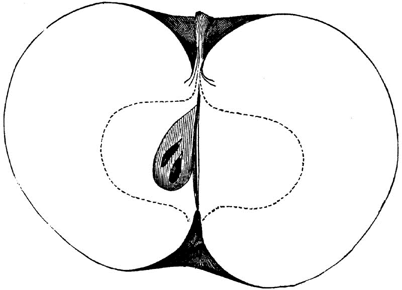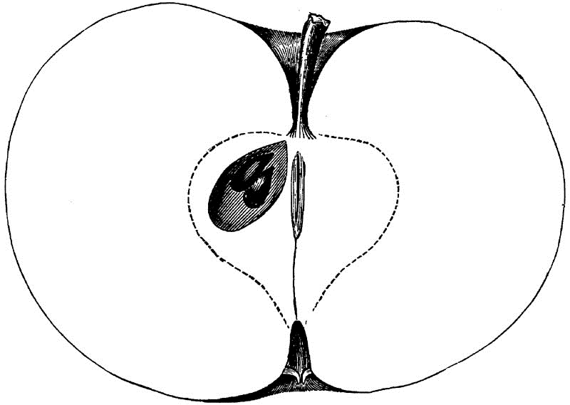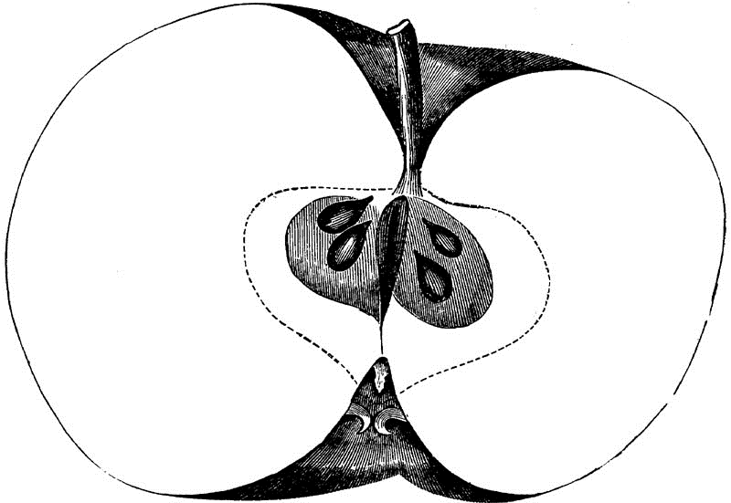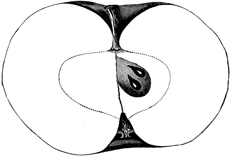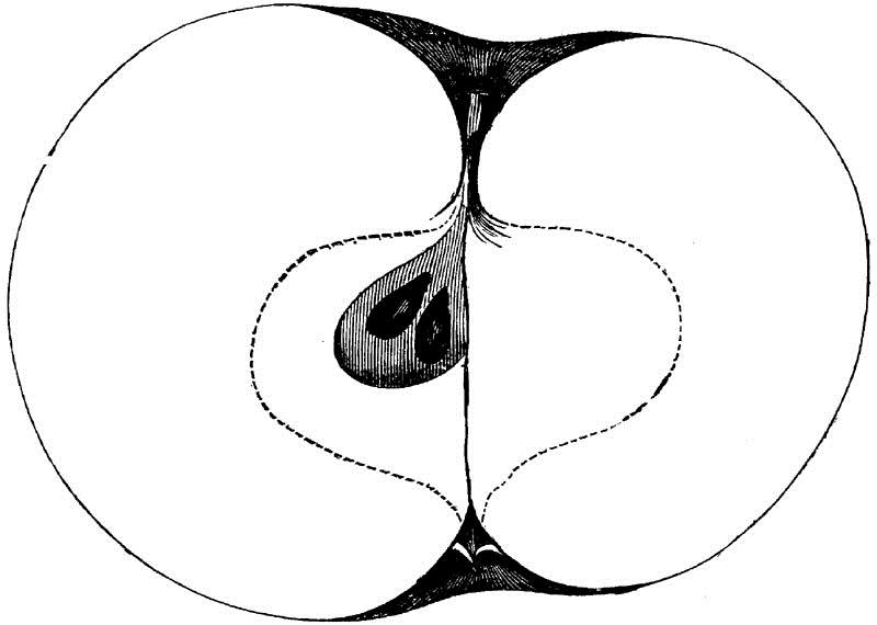 Core roundish, flattened, open, clasping the eye; Seeds numerous, pointed, pale; Flesh tender; Flavor sweet; quality very good; Use, kitchen, stock; Season August, September.