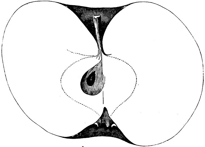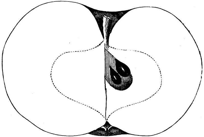Core wide, closed, scarcely meeting the eye; Seeds angular; Flesh yellow, fine grained; Flavor sub-acid, aromatic, and first quality for table or dessert use, in November or later.