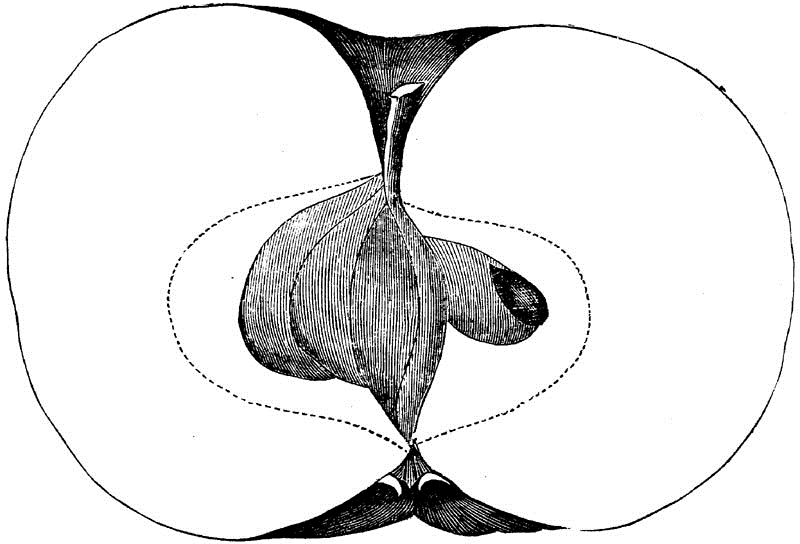 Core heart-shaped, regular, closed, clasping the eye; Seeds few, large, plump, and some imperfect; Flesh yellow, breaking, fine grained, juicy, acid, almost first quality; Valuable for kitchen and market; Season August and September.