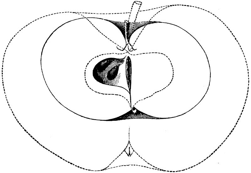 Core very wide, flat, open, clasping the eye; Flesh yellow, fine grained, breaking; Flavor sweet; Quality good, to very good; Use, table and baking; Season, August.
