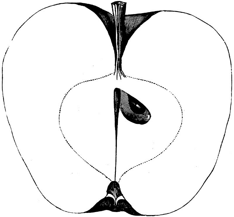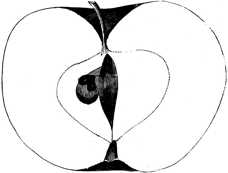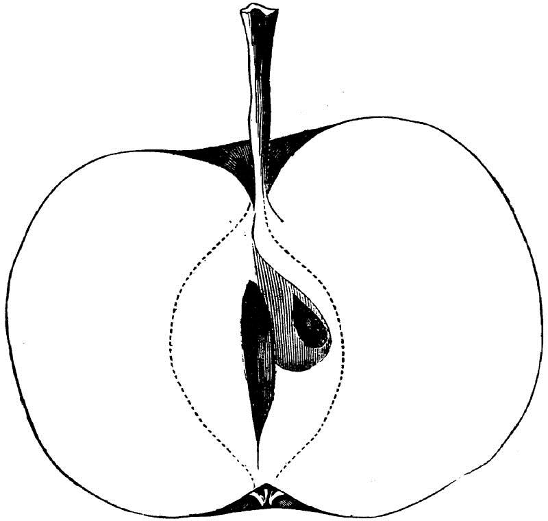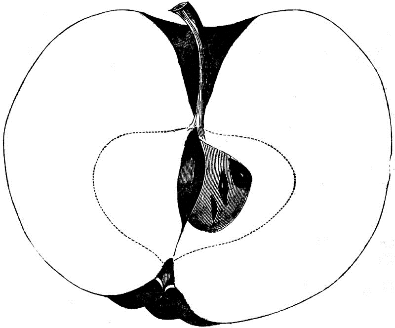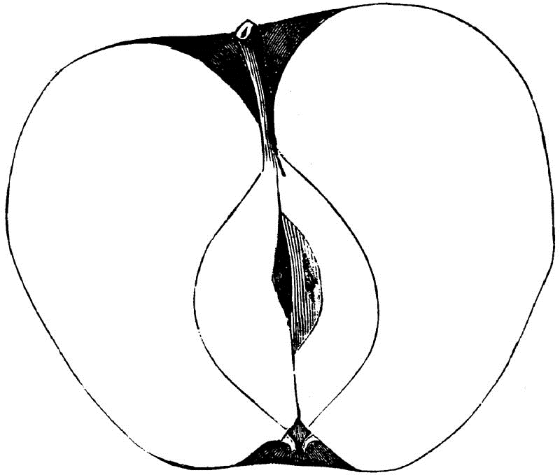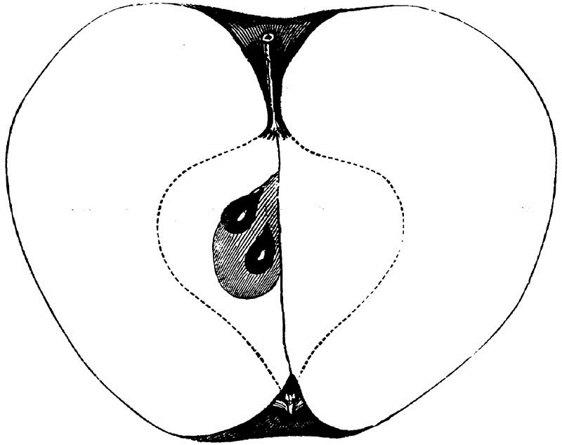 Core large, regular, closed; Axis very short; Seeds numerous, long, pointed; Flesh yellow, tender, fine-grained, juicy; Flavor mild sub-acid, rich, agreeable; Quality best, or nearly so; Use, table, kitchen, drying; Season, October to December.