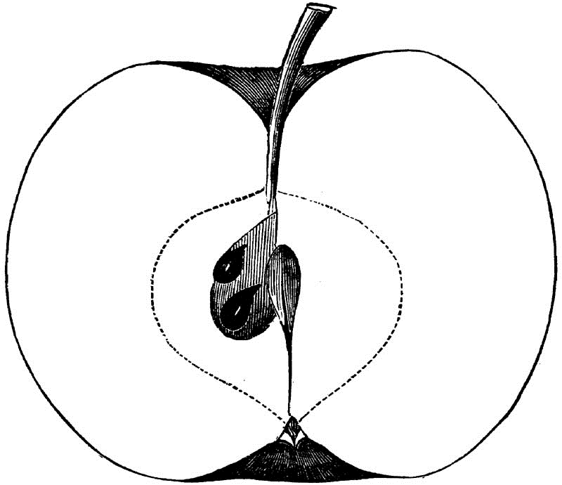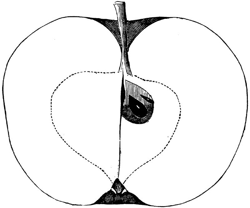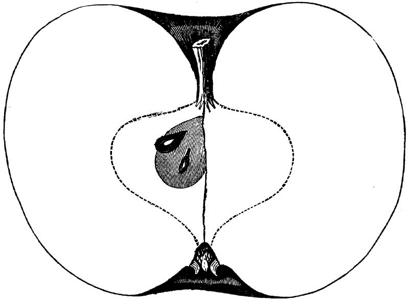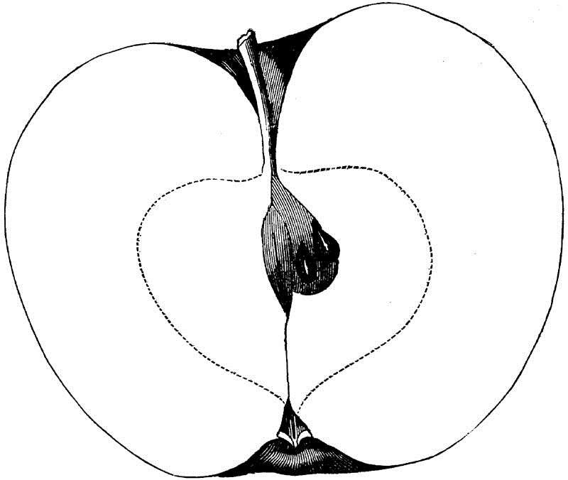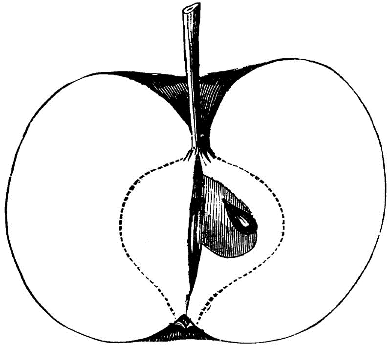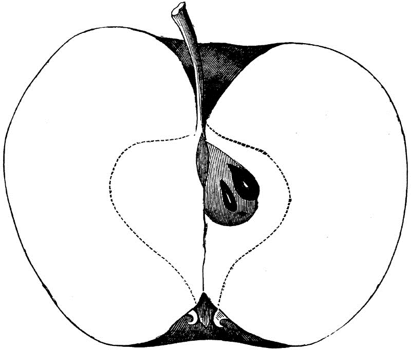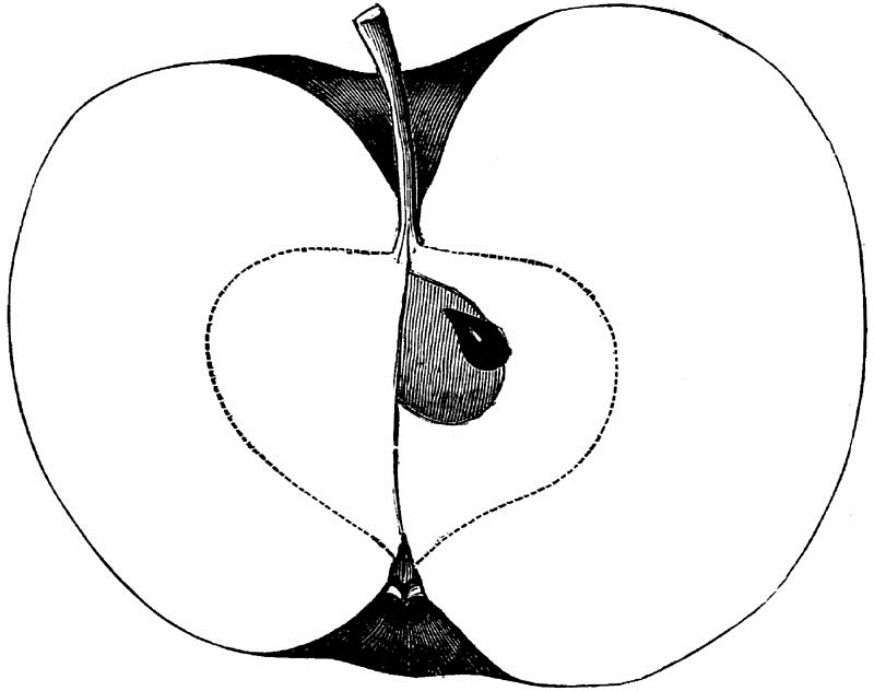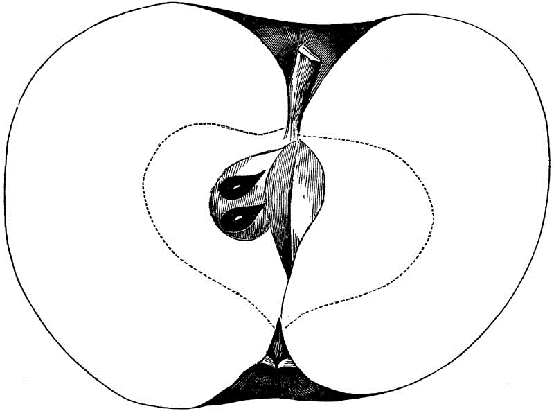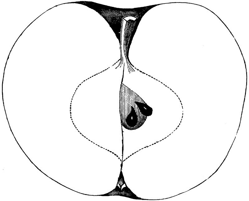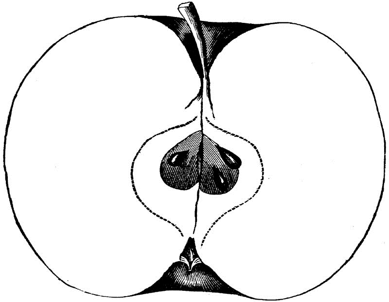 Core round, regular, closed, clasping; Seeds numerous, long, pointed, angular, brown; Flesh white, breaking, fine-grained, juicy; Flavor acid; Quality good; Use, market and kitchen; Season, December, January.