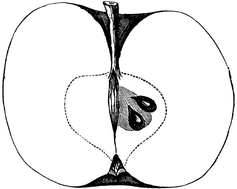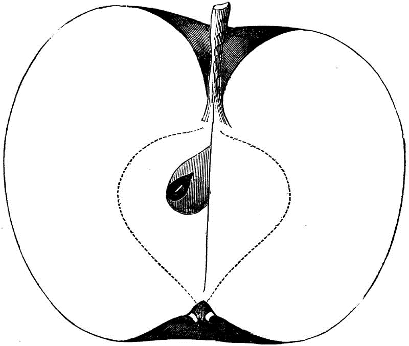 Core regular, medium, ovate, slightly open, clasping the eye; Seeds angular, imperfect; Flesh whitish yellow, breaking, juicy; Flavor acid; Quality only good; Use, cooking and market, for which it is well adapted by its size and appearance; Season, September and October.