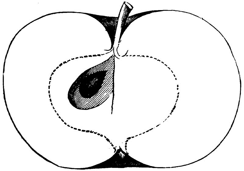 Core round, regular, open, clasping; Seeds large, pointed; Flesh firm, yellowish and greenish, juicy; Flavor acid, rich; the must is very heavy; Quality best for cider; Season, November to January. Also useful for cooking, except on account of its small size; the rich and piquant acid makes it a particularly desirable ingredient in mince-pies.
