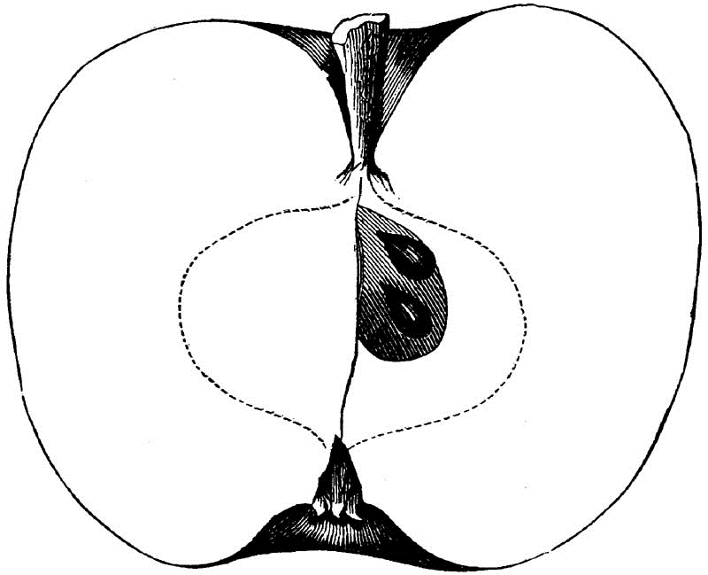Core large, heart-shaped, regular, sometimes partially open, clasping the eye; Seeds few, pointed; Flesh yellow, breaking, fine grained, juicy; Flavor acid, sub-acid, rich; Quality very good; Use, cooking early, table when perfectly ripe; Season, November, December.
