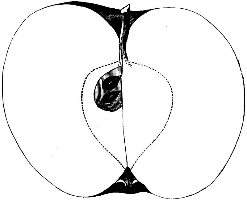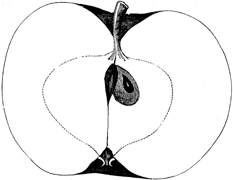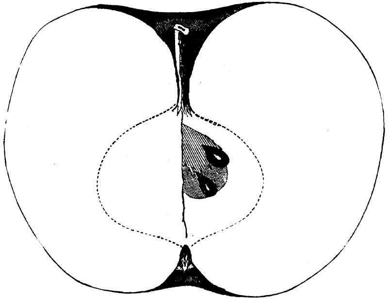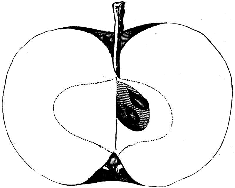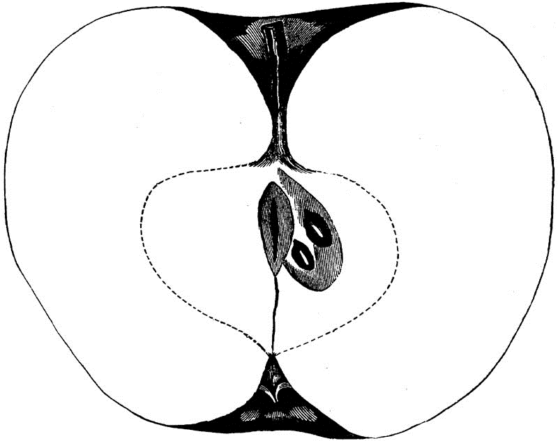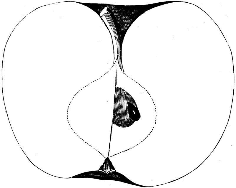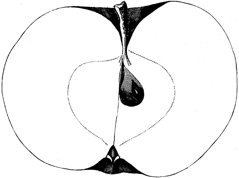 Core regular, round, slightly open, clasping the eye; Seeds numerous, plump and angular; Flesh yellowish, often pink, tender, fine grained; Flavor sub-acid, agreeable; Quality good; Use, dessert; Season, November to January.
