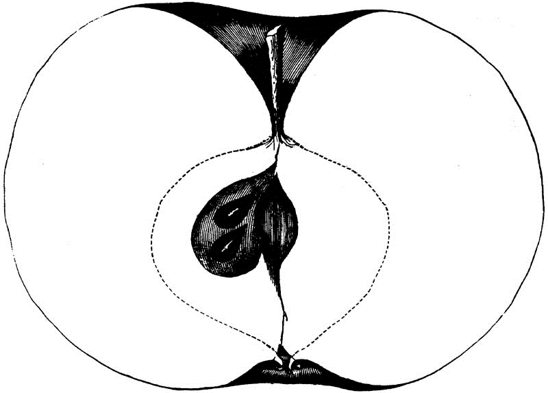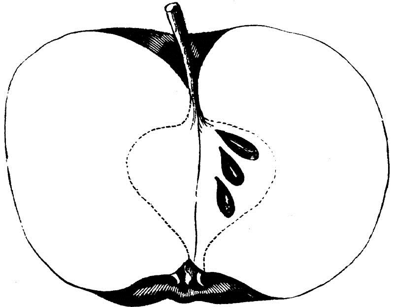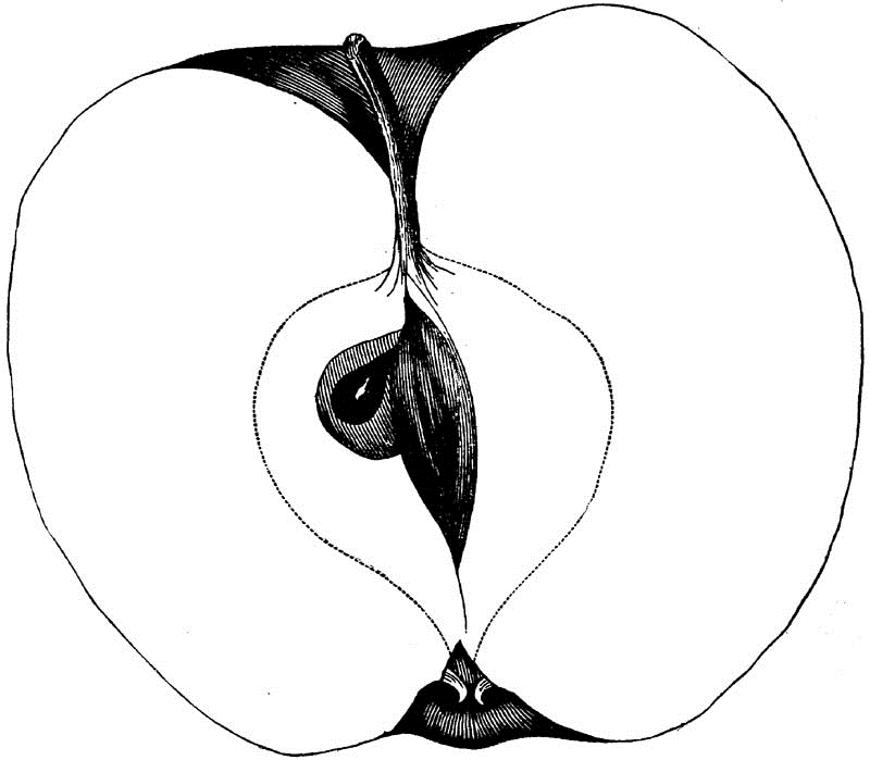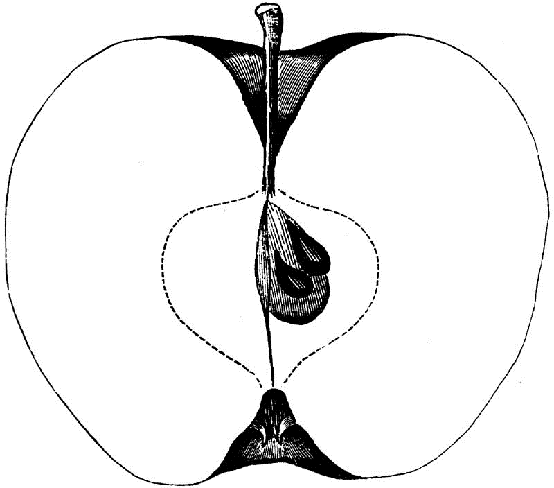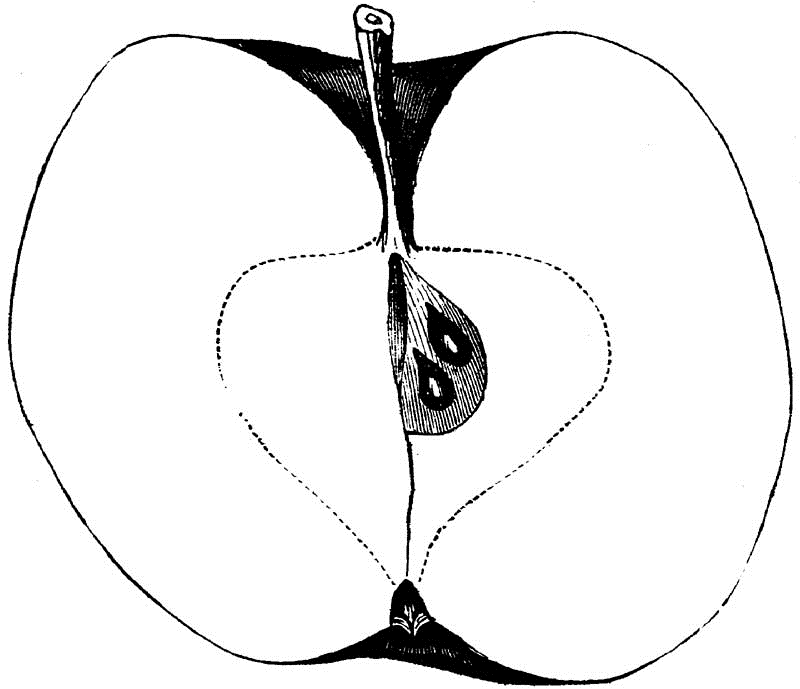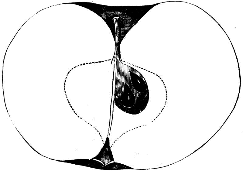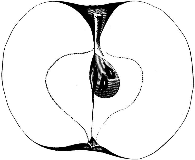 Core regular, round, slightly open, clasping the eye; Seeds numerous, plump and angular; Flesh yellowish, often pink, tender, fine grained; Flavor sub-acid, agreeable; Quality good; Use, dessert; Season, November to January.