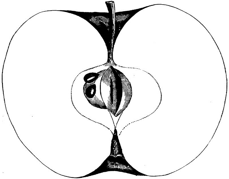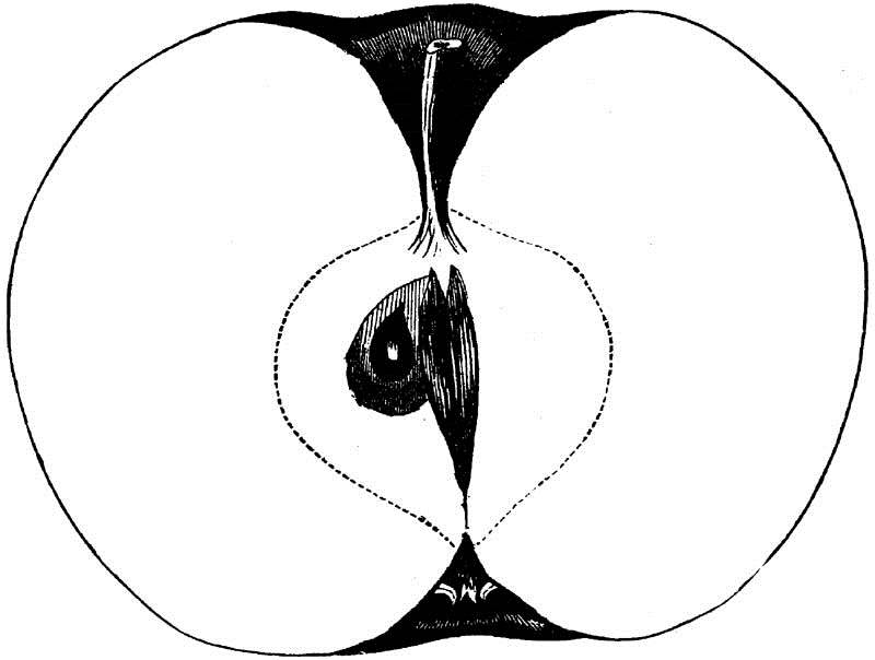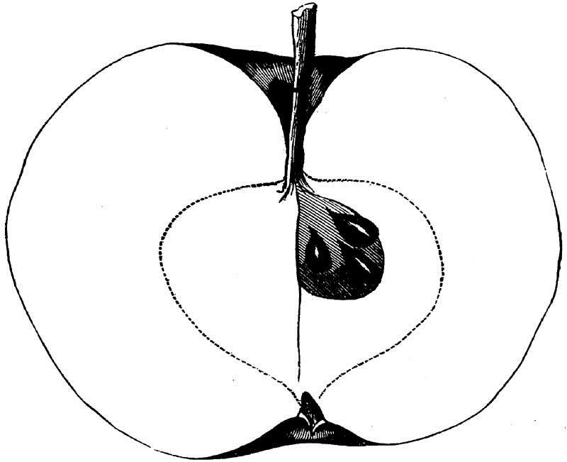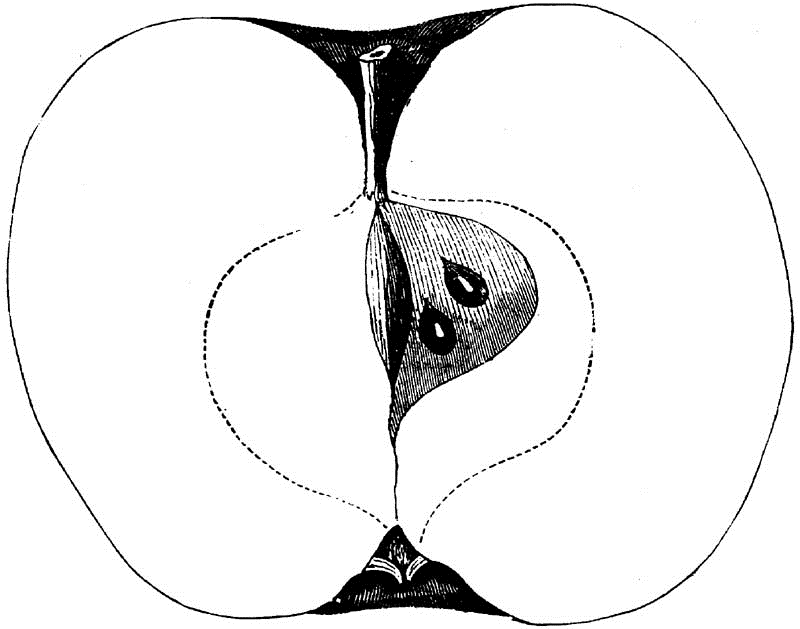 Core small, very wide, open, clasping; Axis short; Seeds numerous, plump, short; Flesh greenish white, breaking, tender, fine-grained, juicy; Flavor acid to sub-acid, agreeable; Quality good; Use, kitchen and table; Season, September to January.