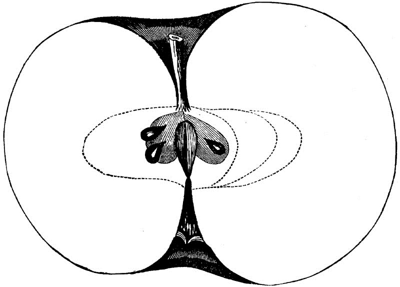 Core medium, round, closed, meeting the eye; Seeds numerous, pointed, brown; Flesh yellow, tender, breaking, fine-grained; Flavor sub-acid, rich; Quality good; Use, table; Season, December.