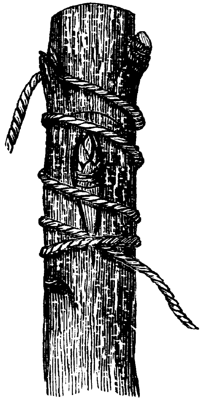 Tying should be done as soon as convenient after the buds have been inserted; though under very favorable circumstances the bud may adhere and do well without any bandaging, no one thinks of leaving the work without carefully tying in the buds, and most budders lay a great deal of stress upon the necessity for covering the whole shield and cut with a continuous bandaging, that shall exclude the light, and air, and moisture. The material most used is bass matting, brought from Russia, as a covering to the packages of sheet iron for which that country is famous. This is the inner bark of the Tilia Europea, but our own Bass-wood, T. Americana, furnishes an excellent bass, and is procured by our nurserymen directly from the trees, by stripping the bark in June, and after it has lain a few days in water, the inner portion separates easily, is dried, and put away for future use. Those who have not provided the bass, are content to apply woolen yarn to tie in the buds; its elasticity adapts it well to the purpose. The ingenious budder, without bass, often finds a substitute for it, and a very good tie, in the soft husks of corn ears, the inner husks are torn into strips and used a little damp, when they are pliant and easily tied, answering a very good purpose. Many nurserymen, who have tried the corn-husk, prefer it to all other material, because it saves them the trouble of removing the bandages, as it decays rapidly, and yielding to the growth of the stock, it falls off before it cuts the bark, which a firmer bandage is apt to do.