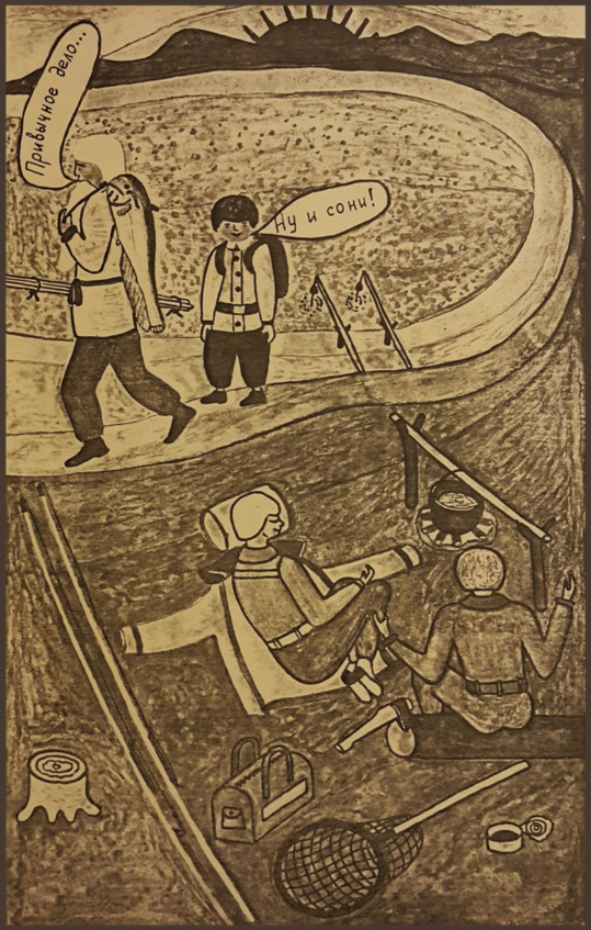 Мы увлеклись подготовкой закидушек и совсем забыли о старике и его внуке. Они сами напомнили о себе. Через час прибежал Минька и попросил у нас спички, сказав, что свои у них отсырели. Вдобавок, он попросил у нас два крючка на закидушку.