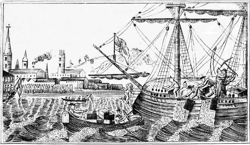 On 16 December, the day before the Dartmouth’s customs payment was due, a crowd of several thousand gathered to hear the ship’s owner, a local merchant, reveal that Governor Hutchinson remained adamant in his refusal to let it depart. As the meeting broke up in the late afternoon, a number of men dressed as ‘Aboriginal Natives’, their faces blackened with coal dust, ‘gave the War-Whoop’, a pre-arranged signal to hurry to the three vessels.[2] Over several hours, by the light of lanterns, these self-styled ‘Mohawks’ smashed open 342 chests of tea and threw them overboard. Next morning, at high tide, the broken-up tea chests could be seen bobbing above a vast slick of briny sludge that stretched across the bay.