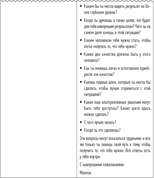 Если вы попросите собеседника дать больше деталей или описать процесс мышления, лежащий в основе важного решения о будущем, то это будет очень полезно для обретения ясности, понимания и вдохновения. Люди получают вдохновение тогда, когда определяют для себя, что значимо в их видении, когда выявляют ключевые моменты в движении к яркому творческому будущему. Вопросы такого рода показывают уважение к человеку, поскольку в их основе лежит предположение, что он может находить собственные ответы. Такой тип регулярной поддержки говорит без слов: «Я верю, что у тебя есть решение. Я верю, что у тебя есть сила и ресурсы, чтобы действовать самостоятельно в этом мире и найти нужные ответы. С тобой все в порядке». В этом контексте, в состоянии глубокого уважения и веры, люди находят собственные ответы.