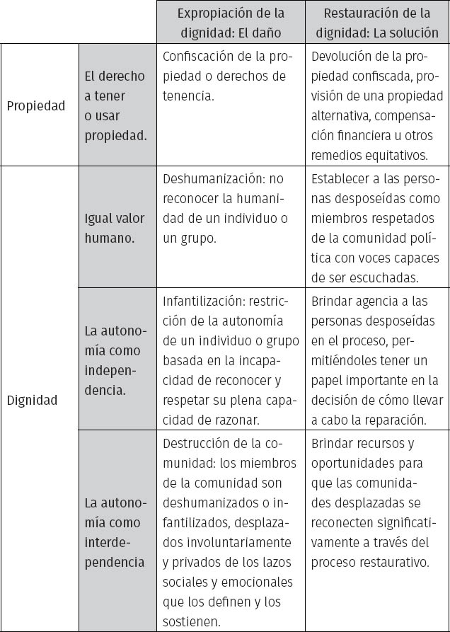 Existen ciertas circunstancias en las cuales un individuo o una comunidad pueden verse privados de su hogar u otras propiedades, por parte de actores estatales o no estatales. Así mismo, hay circunstancias más perjudiciales en las que el despojo ha implicado no solo una expropiación de la propiedad sino también de la dignidad, en tanto la privación de la propiedad se ejerce con actos de deshumanización (la falta de reconocimiento de la humanidad de un individuo o un grupo) o infantilización (la restricción de la autonomía de un individuo o grupo, basada en el hecho de no reconocer y respetar su plena capacidad de razonar). Esto se denomina una «expropiación de la dignidad», que ocurre cuando un Estado destruye o confisca, directa o indirectamente, los derechos de propiedad de dueños u ocupantes obteniendo como resultado su deshumanización o infantilización, ya sea de manera intencional o no. Cuando se ha producido este daño mayor, las simples reparaciones no son suficientes. Se requiere una restauración de la dignidad misma. La restauración de la dignidad es una solución que busca brindar una compensación por la privación de la propiedad al mismo tiempo que recobra la dignidad poniendo a las personas o comunidades en control, dándoles un grado significativo de autonomía para decidir cómo repararse.