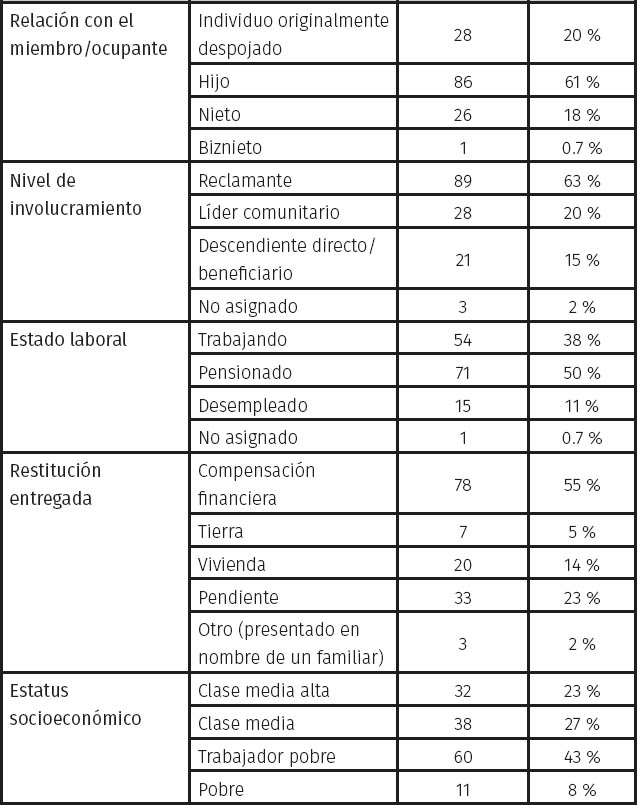 Después escogí reclamantes aleatoriamente dentro de esas comunidades. La Comisión mantenía una lista de personas que habían recibido compensación financiera, la cual fue organizada por comunidades y establecía cuánto dinero había recibido cada persona. Una lista separada de nombres identificaba a las personas que habían recibido viviendas e indicaba el lote de tierra o la casa que habían recibido. Escogí a la quinta persona de cada una de estas listas y solicité que el departamento de archivo de las oficinas de reclamos regionales me diera sus archivos para asegurarme de tener el número de teléfono de los reclamantes. Después yo o un traductor llamamos a cada uno de los reclamantes elegidos aleatoriamente para agendar una entrevista. Alrededor de tres cuartos de los reclamantes tenían un número de teléfono habilitado y disponible en su carpeta del departamento de archivo de la Comisión, y más del 90 % de los reclamantes accedieron a ser entrevistados. Los entrevistados identificaron a los líderes dentro de sus comunidades, a quienes entrevisté y también incluí en la muestra. El Cuadro I.1 describe la muestra resultante de entrevistas.