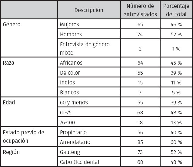 Para investigar el impacto de los recursos provistos para aquellos que fueron desplazados forzosamente de las áreas urbanas seleccioné primero comunidades desplazadas en las provincias de Gauteng y Cabo Occidental (ver Mapa I.1, I.2 y I.3). En la muestra están incluidas comunidades dentro o cerca de Johannesburgo, Soweto, Pretoria y Ciudad del Cabo, las cuales están entre las ciudades más grandes de Sudáfrica. Las comunidades seleccionadas capturaban el rango completo de los tipos de entrevistados incluyendo: africanos, mestizos, asiáticos y blancos; antiguos arrendatarios y propietarios; personas que recibieron compensación financiera, tierra y viviendas; y personas que recibieron compensaciones financieras en cantidades variadas.