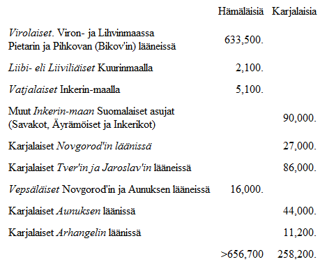 Niinkuin tiedät elää Suomen kansaa, eli kansoja, joiden seassa Suomen kielellä tulet toimeen, ulkopuolella meidän Suomeamme lähes yksi verta kuin meidän rajojen sisällä. Et ole niitä Köppen'in venäjänkielisiä töitä tainnut saada käsillesi, jossa hän tekee tilin Venäjän vallan europalaisen osan kansoista, niiden seassa Suomalaisistakin, ja seuraavat numero-luvut, näistä töistä otetut, eivät sinusta siis tuntune hyvin ikäviltä.