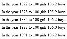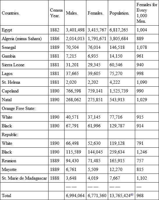 This table shows that, up to the tenth year, the number of boys exceeds that of girls, due merely to the disproportion in births. Everywhere, there are more boys born than girls. In the German Empire, for instance,94 there were born: —
