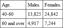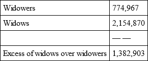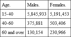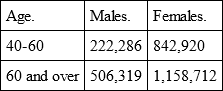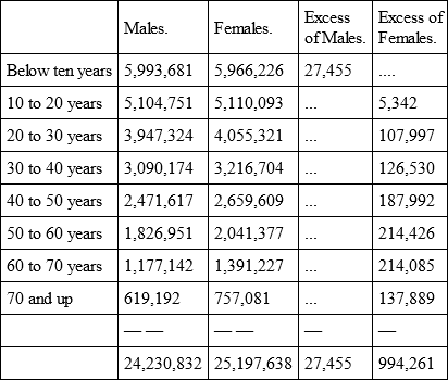 The table shows, furthermore, that at the matrimonial age, proper, between the ages of 20 and 50, the female sex exceeds the male by 422,519, and that at the age from 50 to 70 and above, it exceeds the male by 566,400. A very strong disproportion between the sexes appears, furthermore, among the widowed.