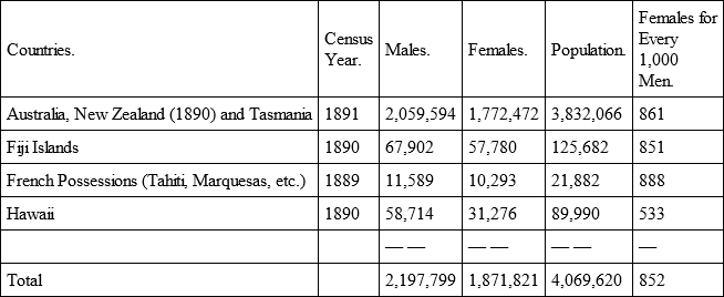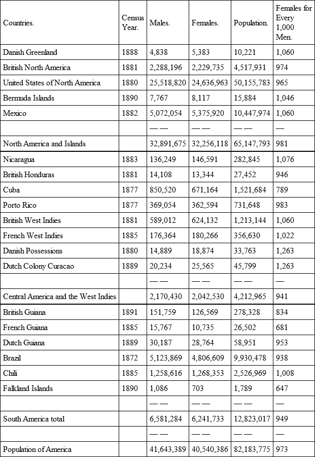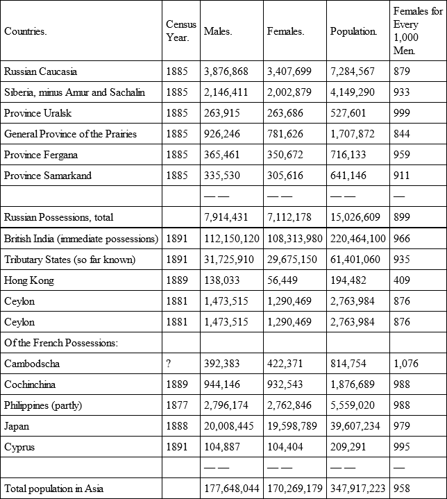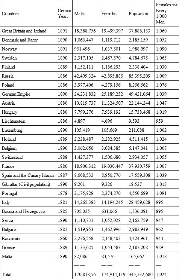 Probably the result of this presentation will be astonishing to many. With the exception of Europe, where, on an average, there are 1,024 women to every 1,000 men, the reverse is the case everywhere else. If it is further considered that in the foreign divisions of the earth, and even there where actual enumeration was had, information upon the female sex is particularly defective – a fact that must be presumed with regard to all the countries of Mohammedan population, where the figures for the female population are probably below the reality – it stands pat that, apart from a few European nations, the female sex nowhere tangibly exceeds the male. It is otherwise in Europe, the country that interests us most. Here, with the exception of Italy and the southeast territories of Bosnia, Herzegovina, Servia, Bulgaria, Roumania and Greece, the female population is everywhere more strongly represented than the male. Of the large European countries, the disproportion is slightest in France – 1,002 females to every 1,000 males; next in order is Russia, with 1,009 females to every 1,000 males. On the other hand, Portugal, Norway and Poland, with 1,076 females to every 1,000 males, present the strongest disproportion. Next to these stands Great Britain, – 1,060 females to every 1,000 males. Germany and Austria lie in the middle: they have, respectively, 1,039 and 1,047 females to every 1,000 males.