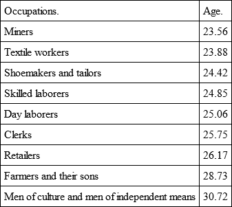 According to E. Ansell, the age of marriage among the cultured and independent males of England was, between 1840-1871, on an average 29.25 years. Since then the average has risen for many classes, by at least one year. For the different occupations, the average age of marriage, between 1880-1885, was as follows: —