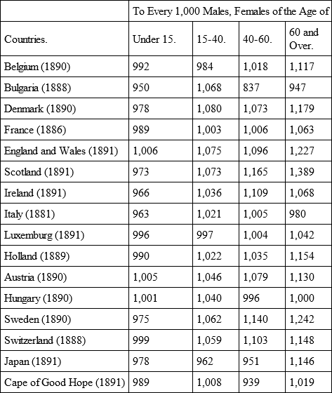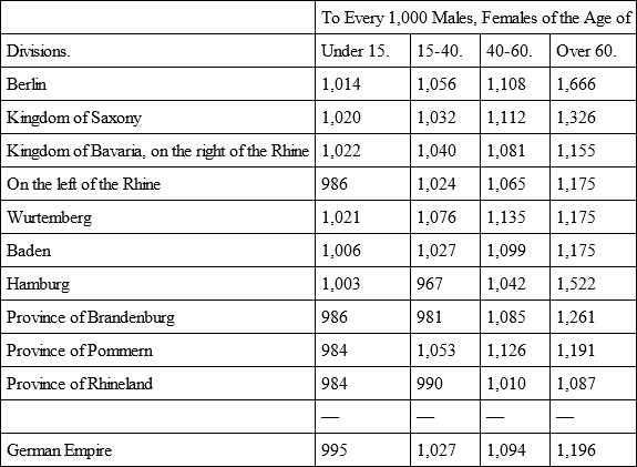 Accordingly, of marriageable age proper, 15-40, the surplus of women in the German Empire amounts to 27 women to every 1,000 men. Seeing that, within these age periods, there are 9,429,720 male to 9,682,454 female inhabitants, there is a total female surplus of 252,734. In the same four age periods, the proportion of the sexes in other countries of Europe and outside of Europe stood as follows: —99