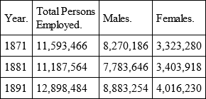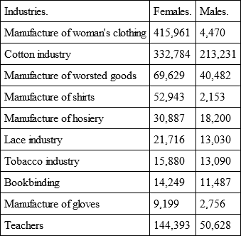 The endeavor, on the part of employers, to extend the hours of work, with the end in view of pumping more surplus values out of their employes, is made easier to them, thanks to the slighter power of resistance possessed by women. Hence the phenomenon that, in the textile industries, for instance, in which women frequently constitute far more than one-half of the total labor employed, the hours of work are everywhere longest. Accustomed from home to the idea that her work is "never done," woman allows the increased demands to be placed upon her without resistance. In other branches, as in the millinery trade, the manufacture of flowers, etc., wages and hours of work deteriorate through the taking home of extra tasks, at which the women sit till midnight, and even later, without realizing that they thereby only compete against themselves, and, as a result, earn in a sixteen-hour workday what they would have made in a regular ten-hour day.124 In what measure female labor has increased in the leading industrial countries may appear from the below sets of tables. We shall start with the leading industrial country of Europe, – England. The last census furnishes this picture: