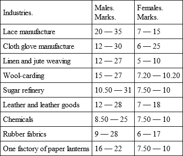 In an investigation of the wages earned by the factory hands of Mannheim in 1893, Dr. Woerishoffer divided the weekly earnings into three classes: one, the lowest, in which the wages reached 15 marks; one from 15 to 24; and the last and highest in which wages exceeded 24 marks. According to this subdivision, wages in Mannheim presented the following picture: —