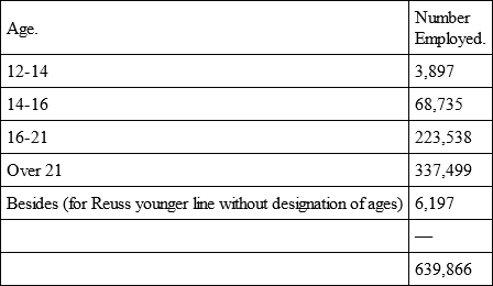 As a result of the new factory regulations, which limited the hours of female labor, between the ages of 14 to 16, to 10 a day, and wholly forbade factory work to children of school age, the number of working-women between the ages of 14 to 16 sank to 6,763, and of girls between the ages of 12 to 14, sank by 6,334. The strongest increase in the number of working-women, as far as we are informed, took place in the tobacco industry of Baden. According to the reports of the Baden Factory Inspector, Dr. Woerishoffer, the number of persons engaged in the said industry and their subdivisions by sexes; was as follows:
