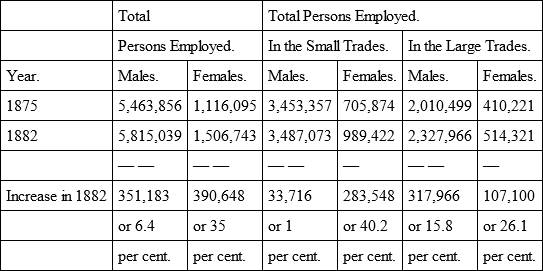 According to these figures, not only did female labor increase by 35 per cent. during the period of 1875-1882, while male labor increased only by 6.4 per cent., but the great increase of female labor, especially in small industries, tells the tale that only by dint of a strong application of female labor, with its correspondingly low wages, can small production keep itself afloat, for a while.