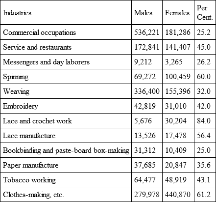 To these must be added 2,248,909 women engaged in agriculture, 1,282,400 female servants, also school teachers, artists, Government office-holders, etc.