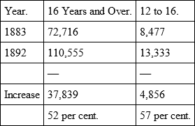 Accordingly, within twenty years, the number of males employed increased 613,068, or 7.9 per cent.; the number of females, however, by 692,950, or 20.9 per cent. It is especially to be observed in this table that, in 1881, a year of crisis, the number of males employed fell off by 486,540, and the number of females increased by 80,638. The increase of female at the cost of male persons employed is thus emphatically brought to light. But within the increasing number of female employes itself a change is going on: younger forces are displacing the older. It transpired that in England, during the years 1881-1891, female labor-power of the age 10 to 45 had increased, while that above 45 had decreased.