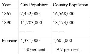 The rapidity is obvious with which the city is surpassing the country population. But the situation is still more unfavorable to the country if the fact is considered that 148 communities, with from 5,000 to 40,000 inhabitants, and aggregating a population of 1,281,000 strong, are included in the rural but really belong to the industrial districts. They are essentially proletarian villages, located near large cities. Furthermore, 647 communities, with from 2,000 to 5,000 inhabitants, and aggregating a population of 1,884,000, are likewise included in the rural, while, to a perceptible degree, they belong to the industrial districts.