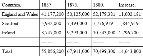 The large landholders are generally intent upon buying up the small holdings, and thereby "rounding up" their estates. The large capitalist magnates have a predilection for investments in land, this being the safest form of property, one, moreover, that, with an increasing population, rises in value without effort on the part of the owners. England furnishes the most striking instance of this particular increase of value. Although due to international competition in agricultural products and cattle-raising, the yield of the land decreased during the last decades, nevertheless, seeing that in Scotland two million acres were converted into hunting grounds, that in Ireland four million acres lie almost waste, that in England the area of agriculture declined from 19,153,900 acres in 1831, to 15,651,605 in 1880, a loss of 3,484,385 acres, which have been converted into meadow lands, rent increased considerably. The aggregate rent from country estates amounted, in pounds sterling, to: —