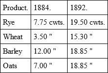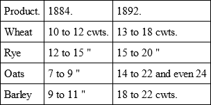 What may be possible even under present conditions is shown by the management of the Schnistenberg farm in the Rhenish Palatinate. In 1884 the same fell into the hand of a new tenant, who, in the course of eight years, raised three or four times as much as his predecessor.198 The said property is situated 320 meters above the level of the sea, 286 acres in size, of which 18 are meadows, and has generally unfavorable soil, 30 acres being sandy, 60 stony, 55 sand loam and 123 hard loam. The new method of cultivation had astonishing results. The crops rose from year to year. The increase during the period of 1884-1892 was as follows per acre: