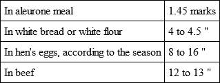 The inventor erected a large factory which produces vegetal albumen or aleurone meal from 80 to 83 per cent. of albumen, and a second quality of about 50 per cent. That the so-called aleurone meal represents a very concentrated albuminous food appears from the following comparison with our best elements of nourishment: