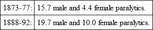 According to observations made in the psychiatric clinic at Vienna, paralysis (softening of the brain) is making by far greater progress among women than among men. To 100 patients taken in, there were in the years: