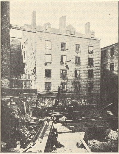 Where the "dens of death" were in Baxter Street, big barracks crowded out the old shanties. More came every day. I remember the story of those shown in the picture. They had been built only a little while when complaint came to the Board of Health of smells in the houses. A sanitary inspector was sent to find the cause. He followed the smell down in the cellar and, digging there, discovered that the waste pipe was a blind. It had simply been run three feet into the ground and was not connected with the sewer.
