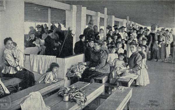 Scores of such scenes are witnessed daily in the floating hospital of St. John’s Guild, the great marine cradle that goes down the Bay every week-day, save Saturday, in July and August, with hundreds upon hundreds of wailing babies and their mothers. Twice a week it is the west-siders’ turn; on three days it gathers its cargo along the East River, where crowds with yellow tickets stand anxiously awaiting its arrival. The floating hospital carries its own staff of physicians, including a member of the Health Department’s corps of tenement doctors, who is on the lookout for chance contagion. The summer corps is appointed by the Health Board upon the approach of hot weather and begins a systematic canvass of the tenements immediately after the Fourth of July, followed by the King’s Daughters’ nurses, who take up the doctor’s work where he had to leave it. With his prescription pad he carries a bunch of tickets for the Floating Hospital, and the tickets usually give out first. Any illness that is not contagious is the baby’s best plea for admission. It never pleads in vain, unless it be well and happy, and even then it is allowed to go along, if there is no other way for the mother to get off with its sick sister. For those who need more than one day’s outing, the Guild maintains a Seaside hospital, three hours’ sail down the Bay, on Staten Island, where mother and child may remain without a cent of charge until the rest, the fresh air, and the romp on the beach have given the baby back health and strength. Opposite the hospital, but out at sea where the breeze has free play over the crowded decks, the great hospital barge anchors every day while the hungry hosts are fed and the children given a salt-water bath on board.