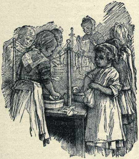 The kindergarten is the city’s best truant officer. Not only has it no truants itself, but it ferrets out a lot who are truants from necessity, not from choice, and delivers them over to the public school. There are lots of children who are kept at home because someone has to mind the baby while father and mother earn the bread for the little mouths. The kindergarten steps in and releases these little prisoners. If the baby is old enough to hop around with the rest, the kindergarten takes it. If it can only crawl and coo, there is the nursery annex. Sometimes it is an independent concern. Almost every church or charity that comes into direct touch with the poor has nowadays its nursery where poor mothers may leave their children to be cared for while they are out working. Relief more practical could not be devised. A small fee, usually five cents, is charged as a rule for each baby. Pairs come cheaper, and three go for ten cents at the nursery in the Wilson mission. Over 50,000 babies were registered there last year, which meant, if not 5,000 separate children, at least 5,000 days’ work and wages to poor mothers in dire need of both, and a good, clean, healthy start for the infants, a better than the tenement could have given them. To keep them busy, when the rocking-horse and the picture-book have lost their charm, the kindergarten grows naturally out of the nursery, where that was the beginning, just as the nursery stepped in to supplement the kindergarten where that had the lead. The two go hand in hand. The soap cure is even more potent in the nursery than in the kindergarten, as a silent rebuke to the mother, who rarely fails to take the hint. At the Five Points House of Industry the children who come in for the day receive a general scrubbing twice a week, and the whole neighborhood has a cleaner look after it. The establishment has come to be known among the ragamuffins of Paradise Park as “the school where dey washes ’em.” Its value as a moral agent may be judged from the statements of the Superintendent that some of the children “cried at the sight of a washtub,” as if it were some new and hideous instrument of torture for their oppression.