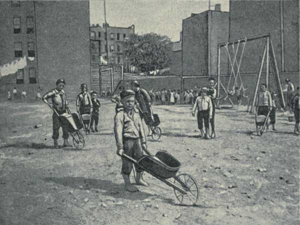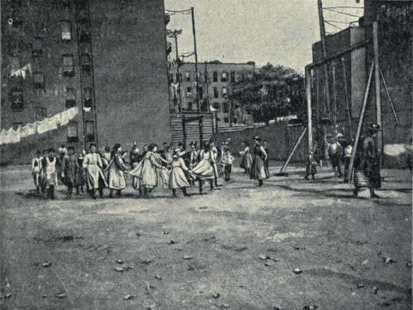 More than two hundred children were digging, swinging, see-sawing, and cavorting about the Poverty Gap playground when I looked in on a hot Saturday afternoon last July. Long files of eager girls, whose shrill voices used to make the echoes of the Gap ring with angry clamor, awaited their turn at the scups, quiet as mice and without an ill word when they trod upon each other’s toes. The street that used to swarm with mischievous imps was as quiet as a church. The policeman on the beat stood swinging his club idly in the gate. It was within sight of this spot that the Alley Gang beat one of his comrades half to death for telling them to go home and let decent people pass; the same gang which afterward murdered young Healey for the offence of being a decent, hard-working lad, who was trying to support his aged father and mother by his work. The Healeys lived in one of the rear houses that stood where the children now skip at their play, and the murder was done on his doorstep. The next morning I found the gang camping on a vacant floor in the adjoining den, as if nothing had happened. The tenants knew the toughs were there, but were afraid of betraying them. All that was only a couple of years ago; but a marvellous transformation had been wrought in the Gap. The toughs were gone, with the old tenements that harbored them. Poverty Gap itself was gone. A decent flat had taken the place of the shanty across the street where a ’longshoreman kicked his wife to death in drunken rage. And this play-ground, with its swarms of happy children who a year ago would have pelted the stranger with mud from behind the nearest truck—that was the greatest change of all. The retiring toughs have dubbed it “Holy Terror Park” in memory of what it was, not of what it is. Poverty Park the policeman called it, with more reason. It was not exactly an attractive place. A single stunted ailanthus tree struggled over the fence of the adjoining yard, the one green spot between ugly and ragged brick walls. The “sand” was as yet all mud and dirt, and the dust the many little feet kicked up was smothering. But the children thought it lovely, and lovely it was for Poverty Gap, if not for Fifth Avenue.