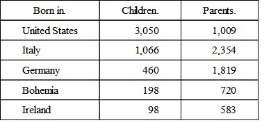 A census of the Society’s twenty-one day schools, that was taken last April, showed that they contained that day 5,132 pupils, of whom 198 were kindergarten children under five years of age, 2,347 between five and seven, and 2,587 between eight and fourteen years of age. Considerably more than ten per cent.—the exact number was 571—did not understand questions put to them in English. They were there waiting to “catch on,” silent but attentive observers of what was going on, until such time as they should be ready to take a hand in it themselves. Divided according to nativity, 2,082 of the children were found to be of foreign birth. They hailed from 22 different countries; 3,050 were born in this country, but they were able to show only 1,009 native parents out of 6,991 whose pedigrees could be obtained. The other 5,176 were foreign born, and only 810 of them claimed English as their mother-tongue. This was the showing the chief nationalities made in the census: