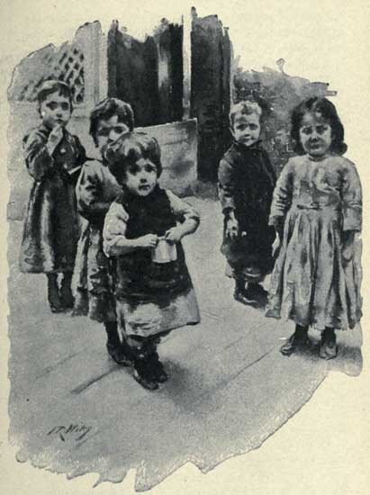 Someone has said that our poor children do not know how to play. He had probably seen a crowd of tenement children dancing in the street to the accompaniment of a hand-organ and been struck by their serious mien and painfully formal glide and carriage—if it was not a German neighborhood, where the “proprieties” are less strictly observed—but that was only because it was a ball and it was incumbent on the girls to act as ladies. Only ladies attend balls. “London Bridge is falling down,” with as loud a din in the streets of New York, every day, as it has fallen these hundred years and more in every British town, and the children of the Bend march “all around the mulberry-bush” as gleefully as if there were a green shrub to be found within a mile of their slum. It is the slum that smudges the game too easily, and the kindergarten work comes in in helping to wipe off the smut. So far from New York children being duller at their play than those of other cities and lands, I believe the reverse to be true. Only in the very worst tenements have I observed the children’s play to languish. In such localities two policemen are required to do the work of one. Ordinarily they lack neither spirit nor inventiveness. I watched a crowd of them having a donkey party in the street one night, when those parties were all the rage. The donkey hung in the window of a notion store, and a knot of tenement-house children with tails improvised from a newspaper, and dragged in the gutter to make them stick, were staggering blindly across the sidewalk trying to fix them in place on the pane. They got a heap of fun out of the game, quite as much, it seemed to me, as any crowd of children could have got in a fine parlor, until the storekeeper came out with his club. Every cellar-door becomes a toboggan-slide where the children are around, unless it is hammered full of envious nails; every block a ball-ground when the policeman’s back is turned, and every roof a kite-field; for that innocent amusement is also forbidden by city ordinance “below Fourteenth Street.”